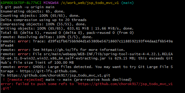 remote: error: File src/main/webapp/WEB-INF/lib/spring-tool-suite-4-4.22.1.RELEASE-e4.31.0-win32.win32.x86_64.self-extracting.jar is 629.15 MB; this exceeds GitHub's file size limit of 100.00 MB