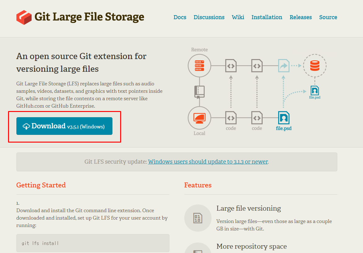 git은 100MB까지만 지원한다. 용량을 초과한 파일은 lfs를 통해 따로 관리해야 한다.