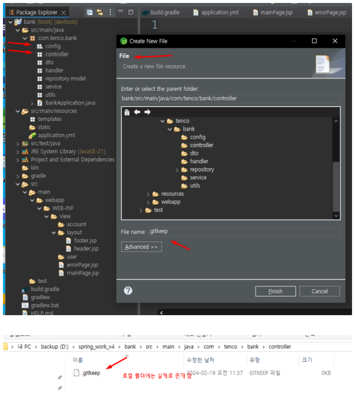 .gitkeep 처럼 숨김 파일을 생성해서 약간 꼼수를 부려 비어 있는 폴더 및 패키지를 commit 및 push 해 봅시다.**