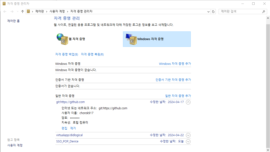 자격 증명 관리자 > Windows 자격 증명 > 일반 자격 증명에서 계정 제거
