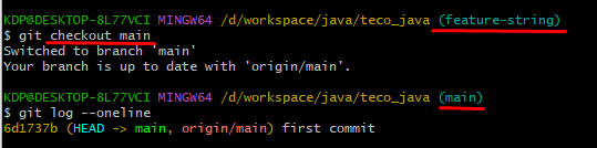 (이동할 브랜치 이름 작성할 때 Tab 키를 누르면 자동완성이 되니 오타 발생을 줄일 수 있다.)