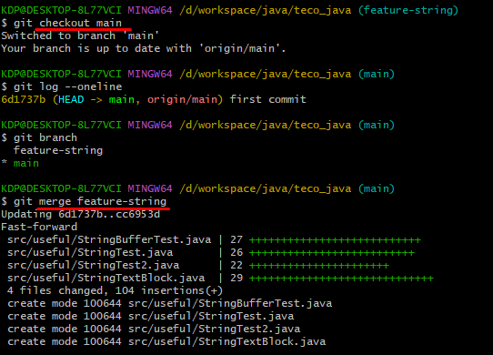 합칠 곳으로 이동해서 'git merge 합칠 브랜치 이름' 입력