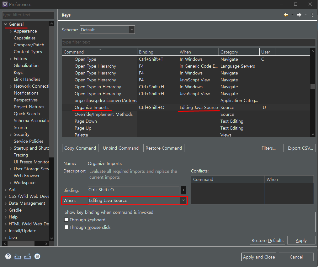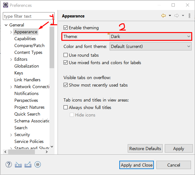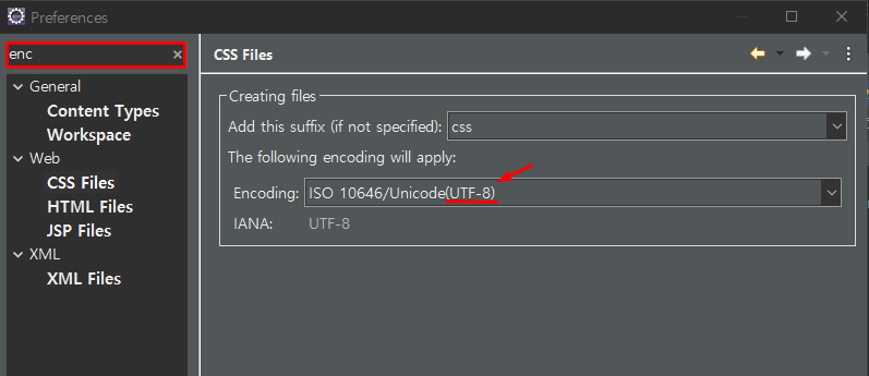 preferances 검색창에 enc 검색 > Encoding 값을 UTF-8로 모두 바꿔주기