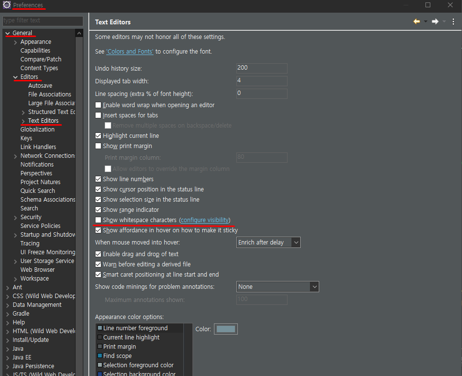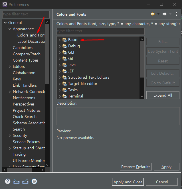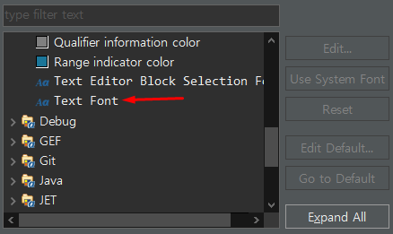 Window > Preferences > General > Appearance > colors and fonts > basic > text font 더블클릭.