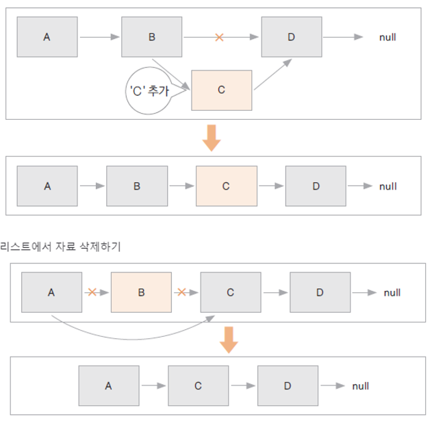 ■ 배열 크기를 변경하려면 데이터를 추가하거나 삭제할 때마다 메모리의 다른 위치로 데이터를 이동시켜야 한다. 이로 인해 추가, 삭제 작업이 많은 경우에는 배열을 사용하는 게 효율적이다.